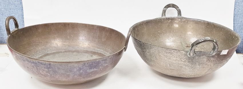 Collection of metalware including Indian bronze kadhai and similar copper Kathiawar, 19th century copper jam pan with loop handles, another copper bowl and a copper kettle, jam pan 39cm diameter (please note VAT will be payable on the hammer)