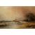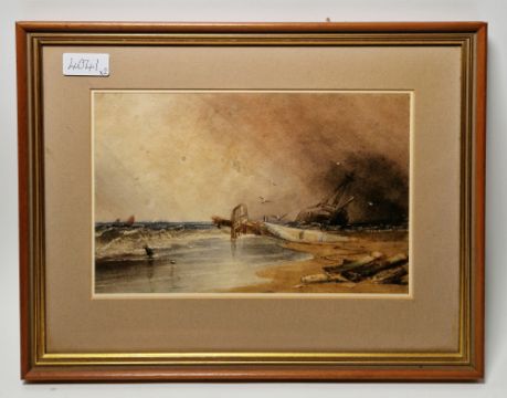 Attributed to Henry Barlow Carter (1803-1868) Watercolour Coastal scene with shipwreck, framed and glazed, inscribed verso mount aperture 15.5cm x 24.5cm, together with a J. Hines (19th century) oil on board depicting a river scene with dwelling, exhibition label verso dated 1898, 19cm x 54.5cm (2)