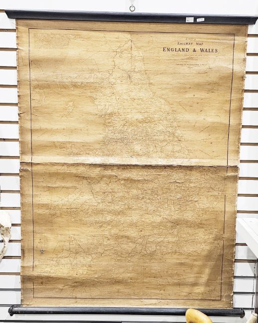 Victorian hanging rolled Airey's railway map of England and Wales, published by McCorquodale & Co Ltd of London, dated 1890, with ebonised wooden poles to top and bottom, 111cm high x 87cm wide together with Great Western Railway diagram map showing the routes, principal stations and routes, 20cm x 53cm and Great Western Railway chart of the working of coaches in trains from and to Paddington, 39cm x 36cm, both framed and glazed (please note VAT will be payable on the hammer) (3)
