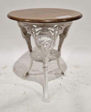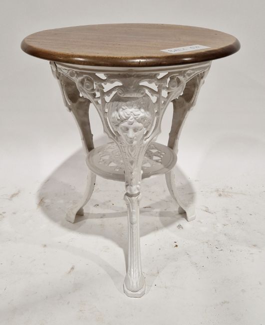 Pub table with circular mahogany top, on a white painted cast iron base, the three legs decorated with face masks and united by a shelf below, 72cm high x 65cm diameter
