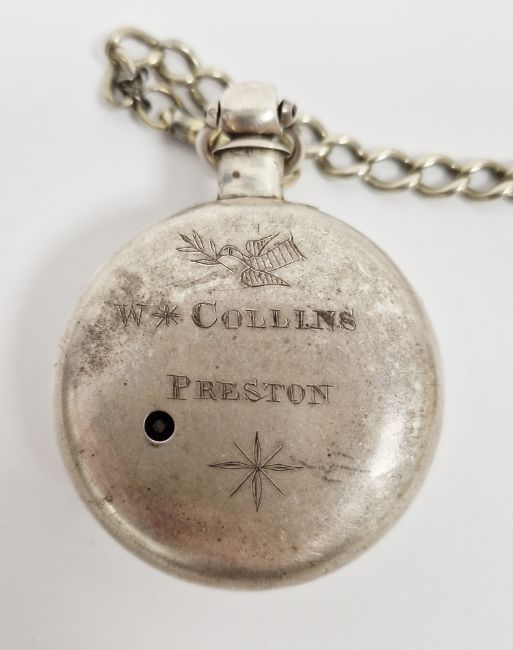 William IV pair cased silver pocket watch, the enamel dial with Roman numeral hour markers, the movement marked Peter Wood, Littlehampton, hallmarked London 1834, with a later silver Albert chain, gross weight approximately 173g (please note VAT will be payable on the hammer)