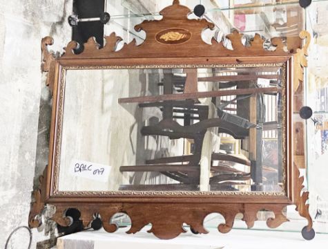 Mahogany and parcel gilt mirror in the George III manner, he fretwork frame inlaid with shell decoration, the rectangular plate with bevelled edge, 75cm x 85cm