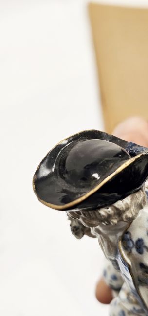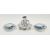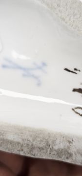 Meissen porcelain figural double salt, late 19th century, blue crossed swords mark, modelled with a youth seated between two baskets, decorated in blue and gilding, 12.7 cm high; together with two German porcelain blue and white quatrefoil teacups and saucers, printed blue Meissen marks (3) Condition Report Meissen double salt- General wear and tear throughout. Small chips to base. Chips to bouquet. Loss to one ribbon garter. Possible restoration.German teacups and saucers. - General wear and tear througohut. Small chip to the rim of one saucer, hairline crack to the other. Firing faults throughout.Please see addiitonal photographs.