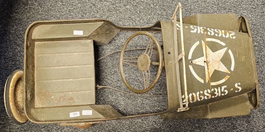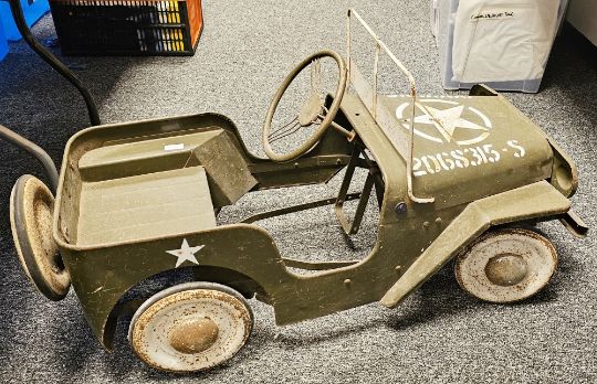 Tri-ang Willys pressed steel General Jeep child’s Pedal carmilitary green body with numbered 2068315-S to the bonnet and USA Army white star
