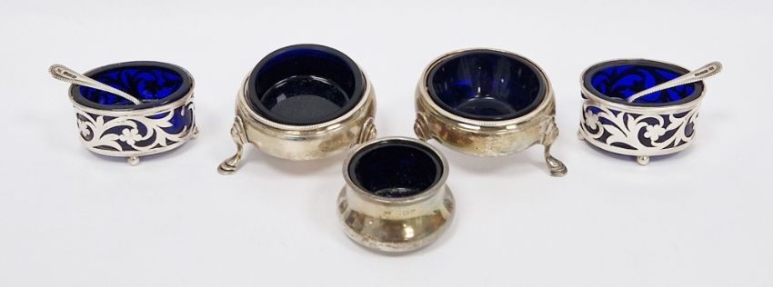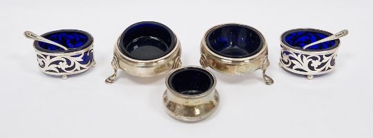 Pair of George III silver circular salts by I S & A N, London 1766, of plain form with beaded borders and three hoof feet, with crest of engraved flag, 6.5cm diameter, a pair of Edwardian silver salts of pierced oval design, one other silver salt and two silver salt spoons, weighable silver 4ozt approx