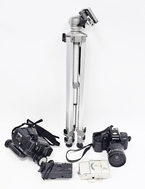 Collection of cameras and equipment including Nikon F-801camera with Nikon AF Nikkor 28-85mm lens, Panasonic palmcorder X16 camcorder, Nikon Lite Touch Zoom camera, Konica A4 camera, folding tripod stand and other items