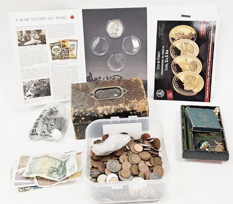 Mixed lot of pre-decimal and decimal coins, British and foreign, including a few Victorian and George V coins, together with some bank notes, National transport tokens and other items