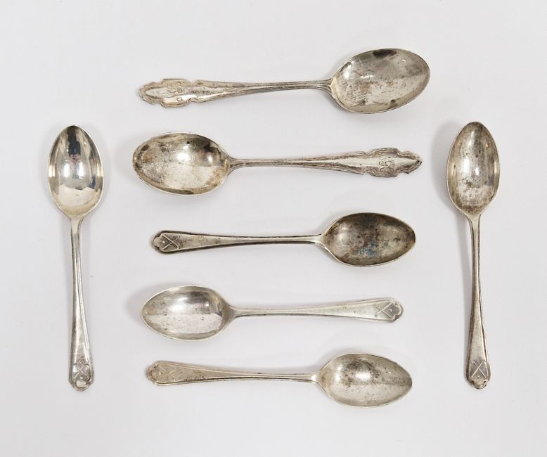 Five silver golfing teaspoons, Sheffield, 1932, Walker & Hall, 2.2.33 ozt & two initialled teaspoons, hallmarked 1931, 1.13 ozt (7)
