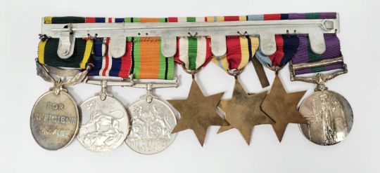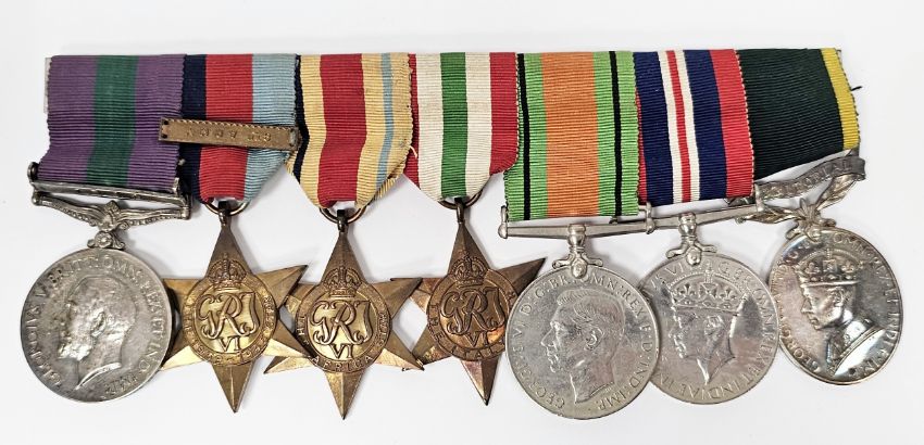 Bar of seven medals including a 1918 George V General Service medal with ribbon and Iraq clasp, awarded to 1044687 Gunner A E Hankins RA together with a 1939-1945 Star, the Africa Star and the Italy Star, the Defence medal and the 1939-1945 medal and an Efficient Service medal also awarded to A E Hankins