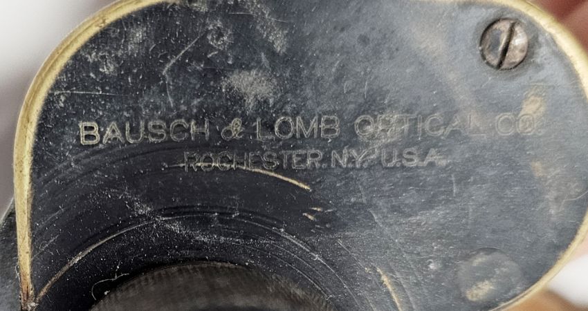 Three trench art brass shell vases, each with flared rims, two with ' The Welsh regiment ' applied badges and the other with ' GR ' applied badge together with trench art brass shell watering can and a leather cased set of military Bausch & Lomb binoculars (5)