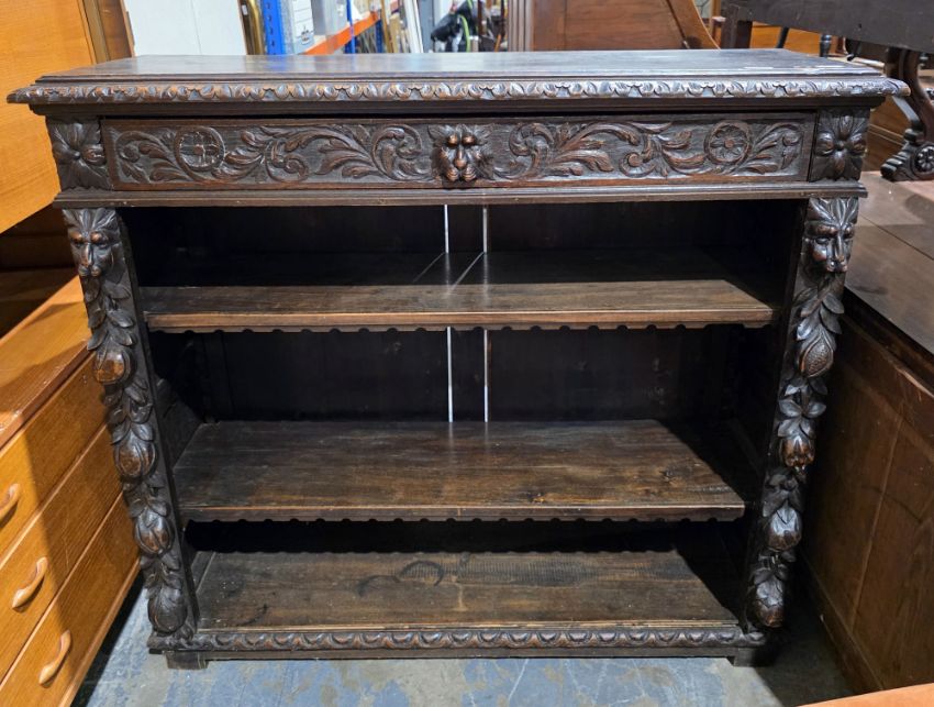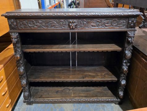 Victorian dark oak dwarf library bookcase, the rectangular top with foliate carved edge, over a long drawer heavily carved with a lion mask handle and foliate scrolls, two adjustable shelves flanked by heavily carved columns including lion mask, fruit and leaves, on stile feet, 111cm high x 122cm wide x 39cm deep