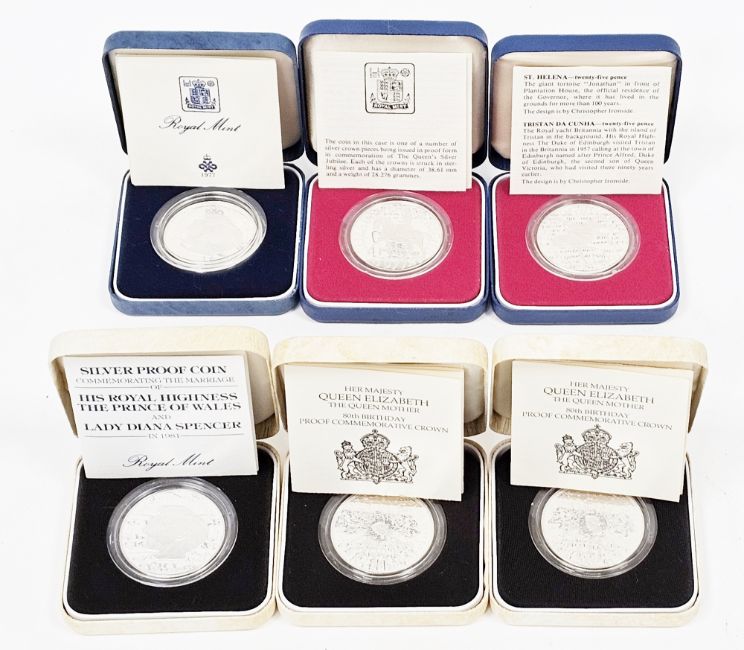 Six cased Royal Mint silver proof commemorative crowns including two Queen's silver jubilee, two marriage of Prince of Wales and Lady Diana Spencer and two Queen Mother 80th birthday, all with certificates