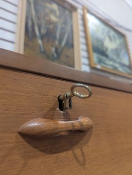 There is some general wear and surface scratching. One of the metal key hole fittings is lacking and two are loose. Some scratching and losses around one keyhole, some scratching to black frames, some noticeable scuffing to edge of drawers, some minor staining and scratching overall to surfaces and some scuffing to extremities overall.