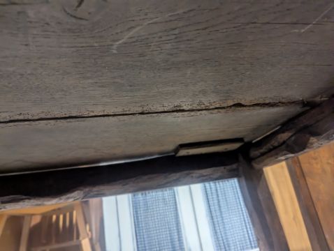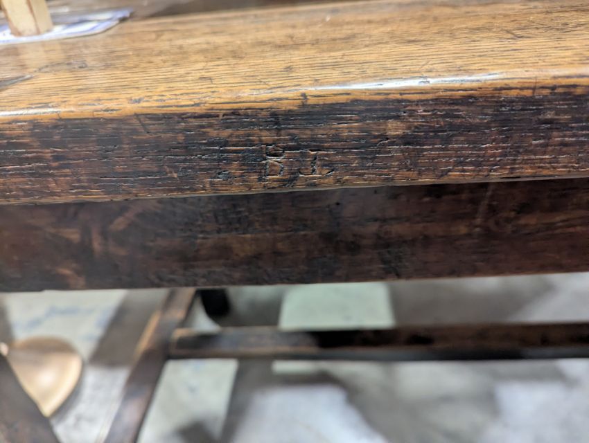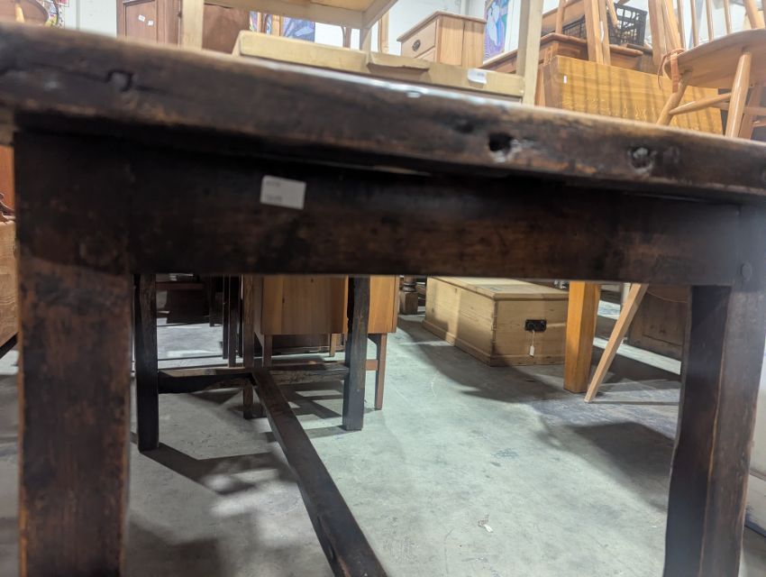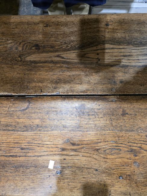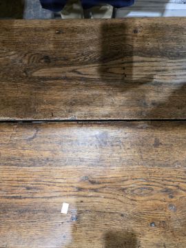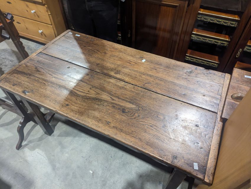 18th century oak dining table, the rectangular two-plank top with cleated ends, on square legs united by a H-stretcher, 70cm high x 130cm long x 71cm wide  Condition Report Please see additional images.Some typical splitting and wear to the top. The top, mainly the underside, has old worm holes. The top is probably a replacement, but it appears to be 18th century. The top has been refixed and there is a metal rivet visible to the top, some pegs are lacking at the side and there are braces to the underside. There is some chipping to the apron (and some of the surface is loose). It is sturdy but there is some typical wear and scuffing to the extremities.