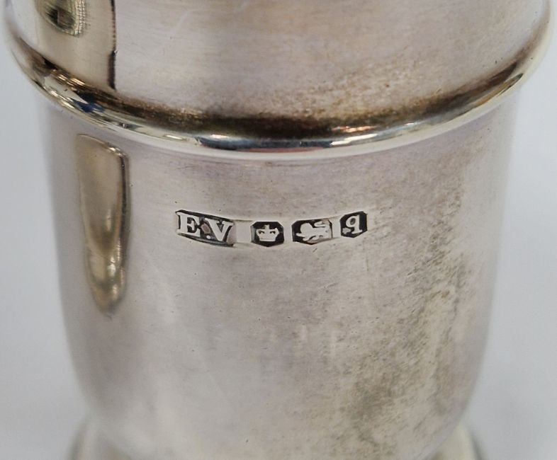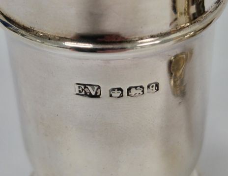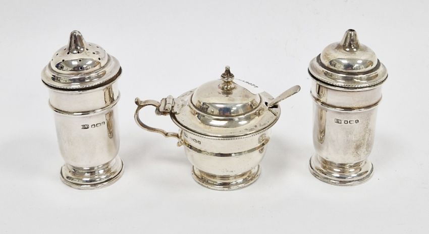 George V silver three piece cruet set, Sheffield1933, Viner's Ltd, of round form with gadrooned edge, the mustard with blue glass liner together with a matched mustard spoon, salt measures 8.5cm high, approximate total silver weight 3.97ozt