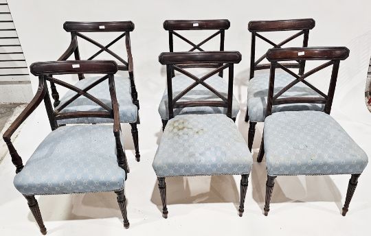 Set of six mahogany Regency dining chairs (including two carvers), with reeded crossed splats with central flower motif, stuffover seats, on turned fluted tapering legs, carvers 83cm high x 53cm wide x 51cm deep (6)