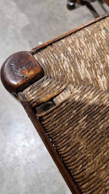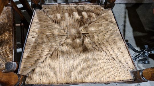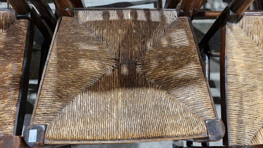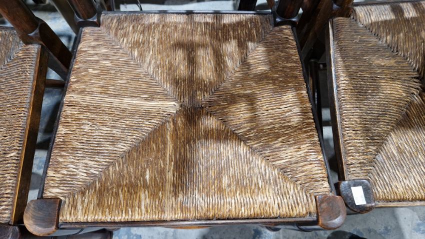 Rush seats with scuffs and marks. One with small area of loss. General wear and tear.