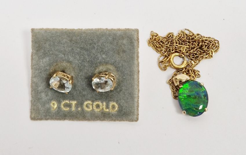 Gold pendant set with oval opal doublet marked 9K, on gilt metal chain and a pair of gold stud earrings (please note VAT will be payable on the hammer)