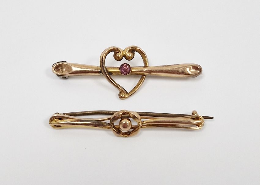 Victorian gold bar brooch with heart decoration, marked 9ct and another gold bar brooch, marked 9ct, total weight 3g approx (2)