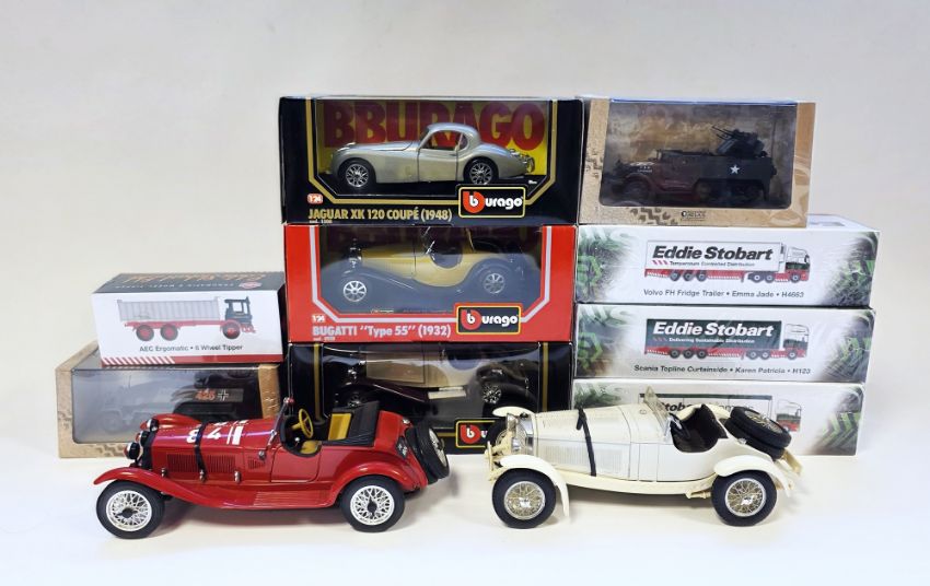 Quantity of boxed dicast models to include Burago 1/24 scale 1508 Jaguar XK 120 Coupe (1948) Burago 1/24 scale 0538 Bugatti "Type 55", Burago 1/24 scale 1509 Mercedes-Benz SSK (1928), Eddie Stobart H8200 Scania R440 Highline Walking Floor Trailer, Eddie Stobart H123 Scania Topline Curtainside, Eddie Stobart H4663 Volvo FH Fridge Trailer, Eddie Stobart AEC Ergomatic 6 Wheel Tipper, Editions Atlas Collections Multiple Gun Motor Carriage M16, Editions Atlas Collections Hanomag SdKfz 251/1 and two unboxed models Burgao 1/18 scale Mecdes Benz SSKL 1931 and Polistil Alfetta 1750 (one box)