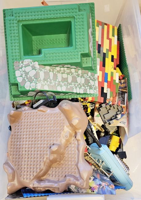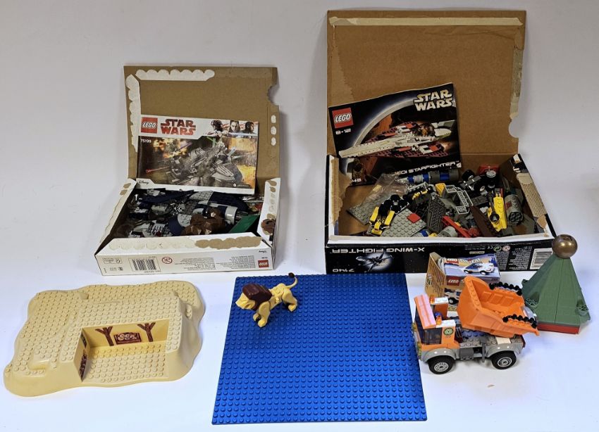 Two boxes of mostly loose Lego and Mega Blocks to include part-built Star Wars 75199 set, tiny Millennium Falcon, Lego System 2880 and various other part sets to include Doctor Who, Zoo Animals and the box for Star Wars 7140 X-Wing Fighter (please note all sets unchecked for completeness) (Please Note VAT payable on hammer)