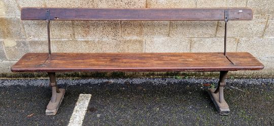 Late 19th/early 20th century reversible tram bench, the adjustable back with elm back rail and elm seat, on a cast iron frame, 82cm high x 197cm long x 38cm deep