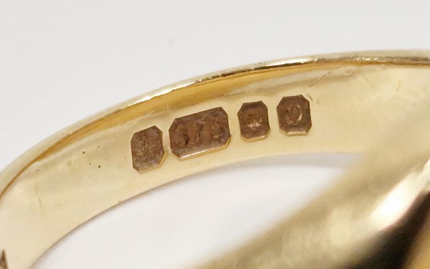 9ct gold signet ring engraved with a lion crest, finger size I½ and a 9ct gold wedding band, finger size M, total weight 7.9g approx (2)