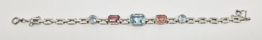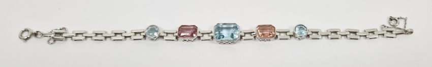 Early to mid-19th century white metal bracelet formed of rectangular polished links and set with a central emerald-cut aquamarine flanked by two mixed cut rectangular pink stones (probably tourmaline) and terminating in two further circular aquamarines, 15.4g approx (unmarked)