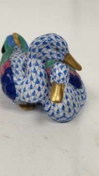Herend porcelain small oval pierced basket, decorated with Rothschild Birds pattern, 9.5cm wide and a Herend model of ducks decorated in blue scale pattern, 10cm long, printed blue marks (2)  Condition Report Basket - Accretions, tiny chips to leaves.Ducks - Good order, no damageGeneral wear and tear.