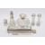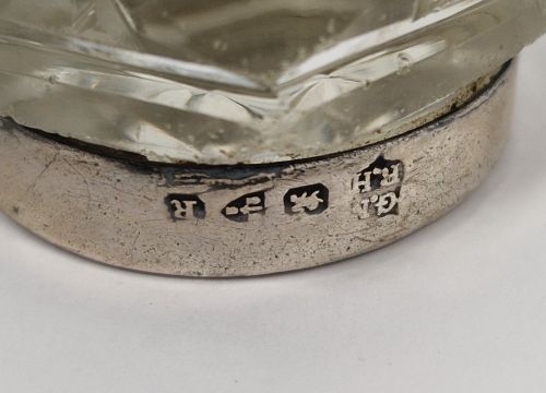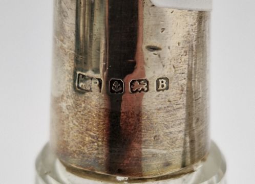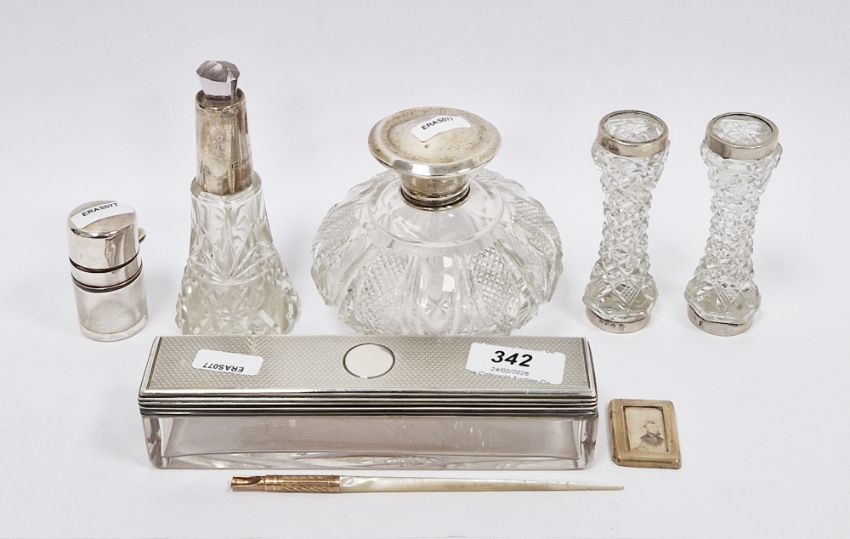 Collection of six early 20th century glass silver mounted items including three perfume bottles, pair of silver rimmed specimen vases, 9.5cm high and a rectangular dressing jar with silver lid together with a yellow metal and mother of pearl ' Fairchild 4 ' dip pen (nib a/f) and a small silver photograph frame (8)