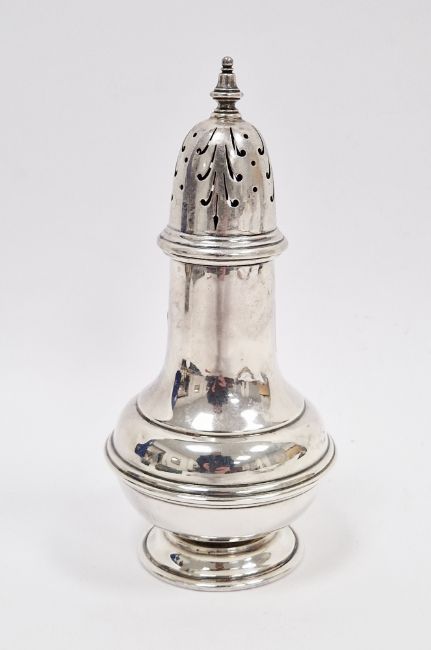 George V silver sugar shaker, Birmingham 1911, S W Smith & Co, of squat baluster form, pierced dome lid , on circular spreading foot, 17.5cm high, approximate weight 5.28ozt