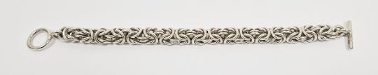 Heavy multi-link silver-coloured bracelet with T-bar clasp, 102g approx (tests as low grade silver)