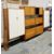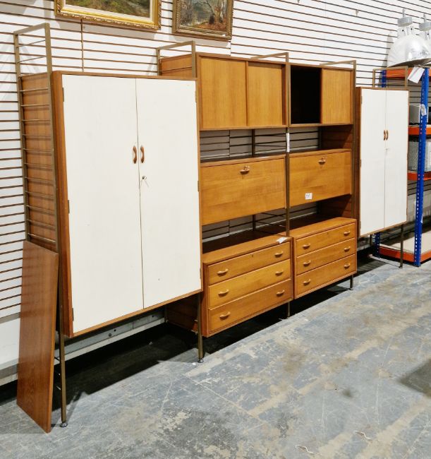 Mid-century Ladderax teak and metal modular wall unit designed by Robert Heal for Staples, comprising two sections, each with two panel sliding doors above a cupboard with drop front and three drawers below, flanked either side by two pairs of white cupboard doors opening to a hanging space and shelving (with keys), 201cm high x 365cm wide x 44cm deep overall  Condition Report The back legs are shorter/ cut off, please see attached images.