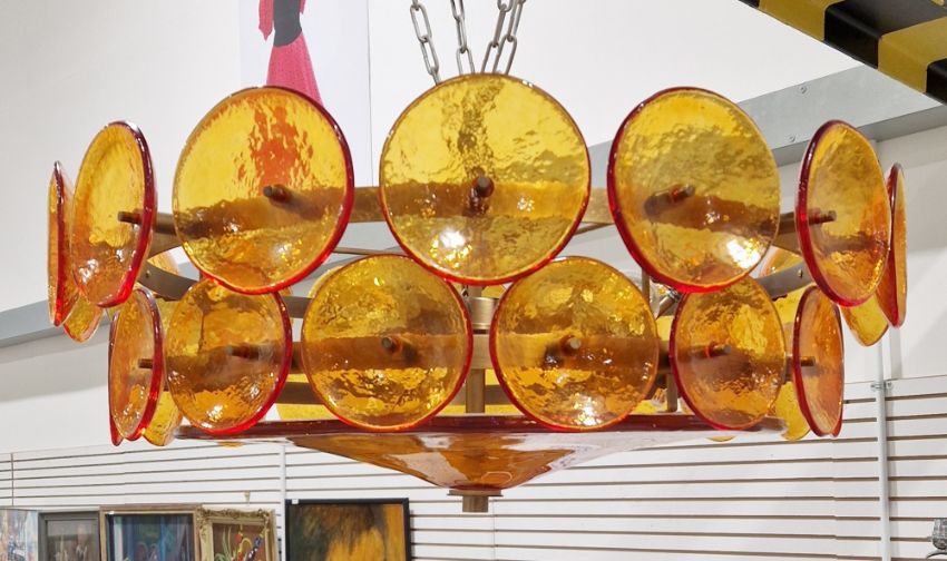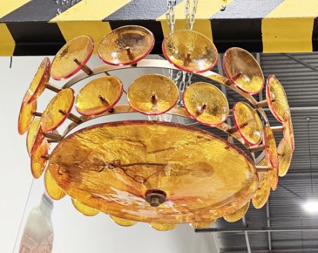 Soho Home Lorenzo chandelier formed from two round tiers of amber glass discs, on a coppered frame, 29cm high x 76cm diameter