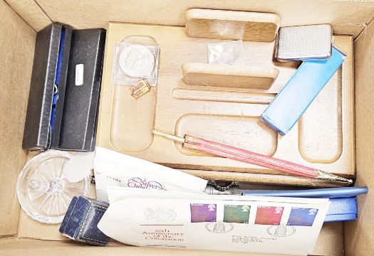 Mixed lot of collectables including cased timber scribe or race knife, Ronson lighter, BP items including commemorative medallions, penknife, watches and first day covers, enamel and other badges, silver fob medal, drawing instruments, binoculars and other items