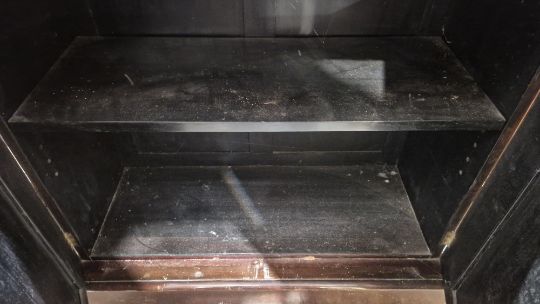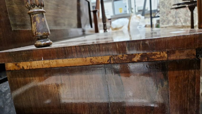 The upper tier/gallery of each chiffonier is lacking. There are scratches and scuffing, some losses to veneer, fading and staining to each. Locks replaced, some mouldings are lacking.