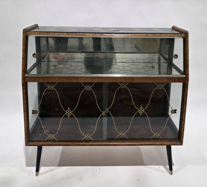 1950's walnut-framed glass display cabinet, the top with a glass black panel decorated with gold-coloured flowers over a pair of sloping sliding doors and a further pair of glass sliding doors, on ebonised black tapering legs with brass caps, 99cm high x 102.5cm wide x 35cm deep