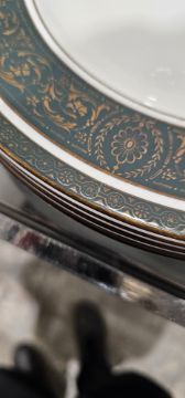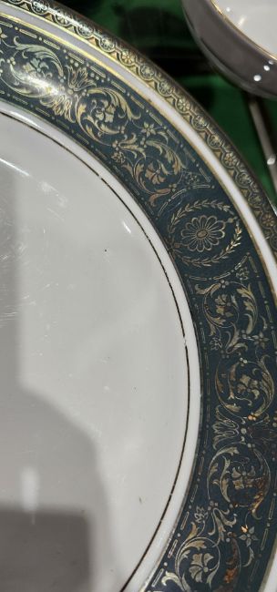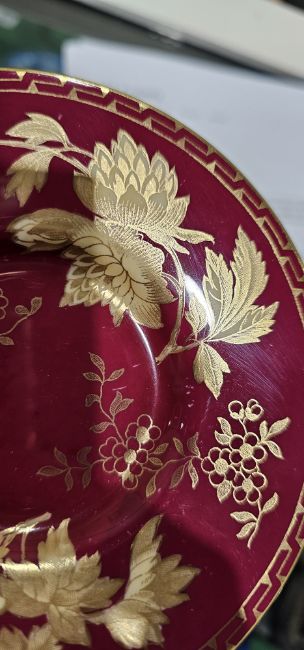 Royal Doulton Vanborough pattern bone china dinner service for ten, dark green borders printed with gilt flowerheads and scrollwork, comprising ten dinnerplates, ten luncheon plates, ten side plates, nine two-handled soup cups, ten stands, four oval stands together with a Wedgwood claret ground part coffee service, gilt with flowersprays, printed green portland vase marks, red pattern no W2488, comprising six coffee cans and saucers  Condition Report Royal Doulton Vanborough - General wear and tear throught. Especiallly wear and surface scratches to plates. Pattern wear throughout. Some significant scratches present. Small chip/firing fault to the base of one dinner plate. Gilt loss. Some makrking throughout. Chip to the foot of two soup cups.Wedgewood claret - General wear and tear throughout. Chip and crack ot one coffee can, surface scratches escecially to saucers.Both show signs of use. Please see additional images.