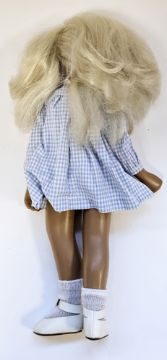 Vintage Sasha doll with blonde hair in blue & white checked dress, socks and white shoes