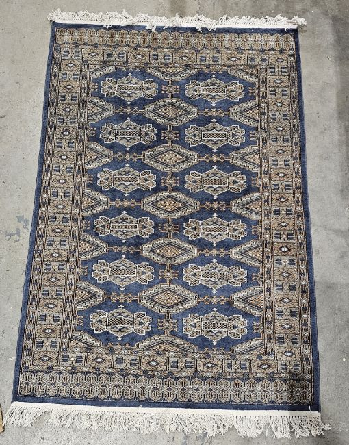 Large blue ground rug with one row of five octagonal medallions flanked by two rows of six geometric medallions, multiple geometric borders flanked by single geometric border, 188cm x 124cm