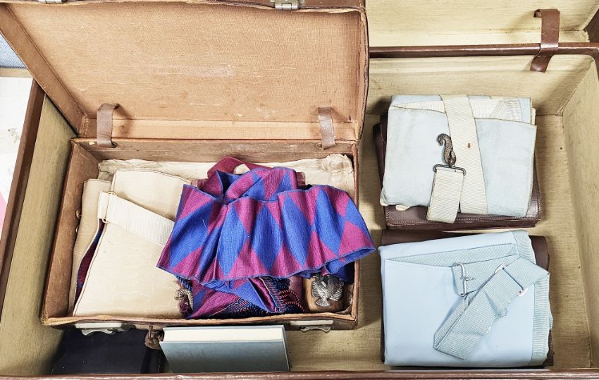 Case of masonic items including silver gilt and enamel badge, silver gilt badge, various sashes, constitutional books and other items