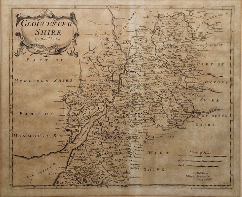 Robert Morden - a late 17th century engraved map of Gloucester Shire (Gloucestershire). With cartouche to upper left reading Gloucester Shire by Rob. Morden. lower right, Sold by Abel Swale Awnsham & John Churchill, framed and glazed, mount aperture 37cm x 44cm.