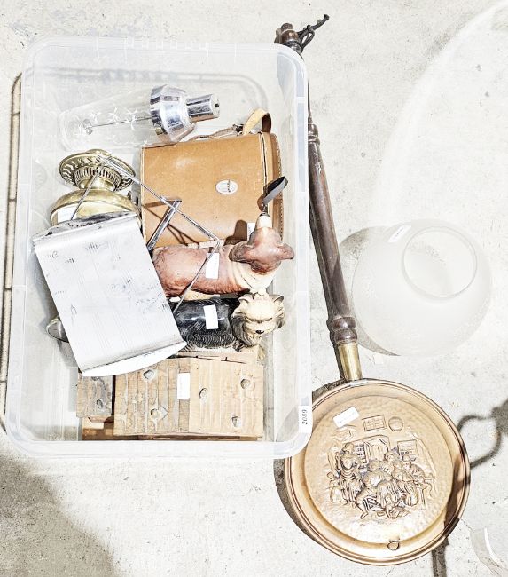 Collection of mixed items including two ceramic dogs, a cocktail shaker, a copper warming pan, binoculars and a Bavarian house jewellery box