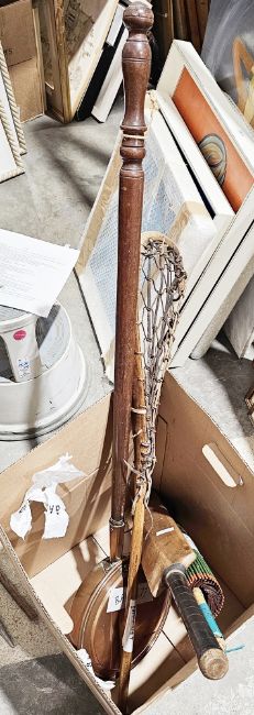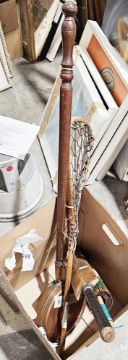 Collection of items including a hunting crop with antler handle, a shooting stick, various walking sticks, a cricket bat, a copper bedwarmer, a Japanese paper parasol and a lacrosse stick