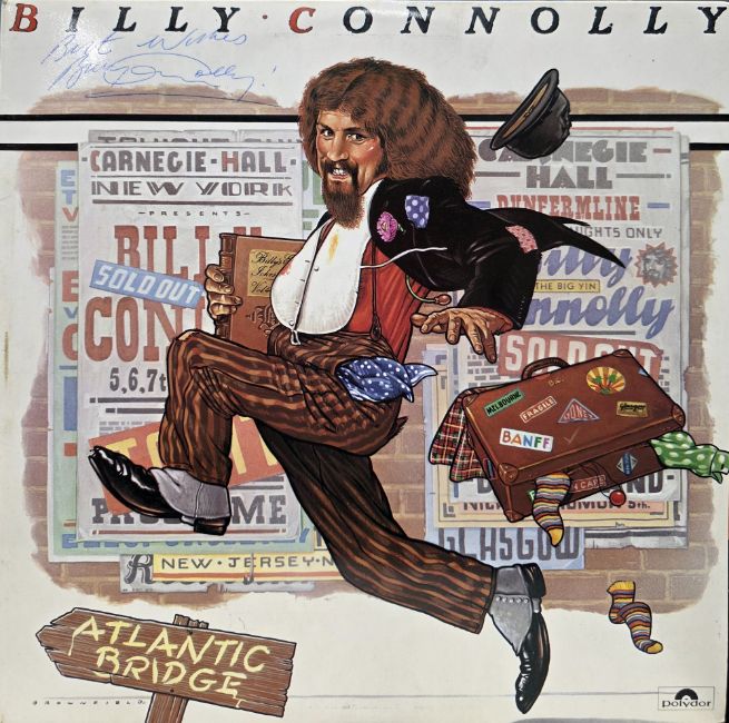 Autographed Billy Connolly vinyl LP, Atlantic Bridge with two carry cases of 45rpm singles