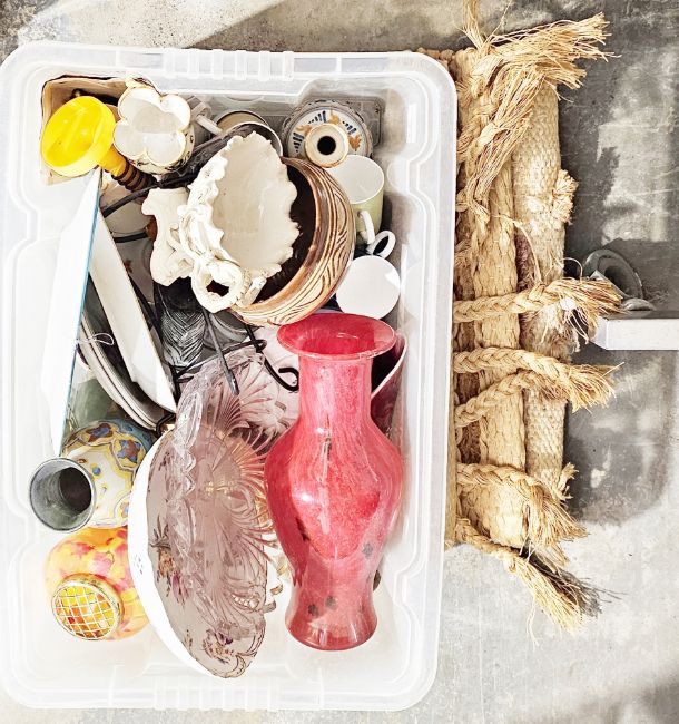 Mixed lot of ceramics, coloured glass and other items including a Crown Ducal bowl, a Royal Doulton Hey Diddle Diddle sugar bowl, coloured glass vases and animals and other items (2 boxes)