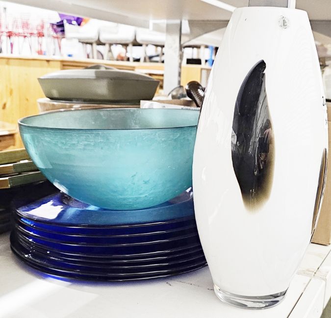 Collection of glassware including an Ikea black and white vase, 36cm high, a mottled green glass fruit bowl, eight blue glass dinner plates, six decanters, boxed Arc fish serving plates and other glassware and a selection of drinking glasses