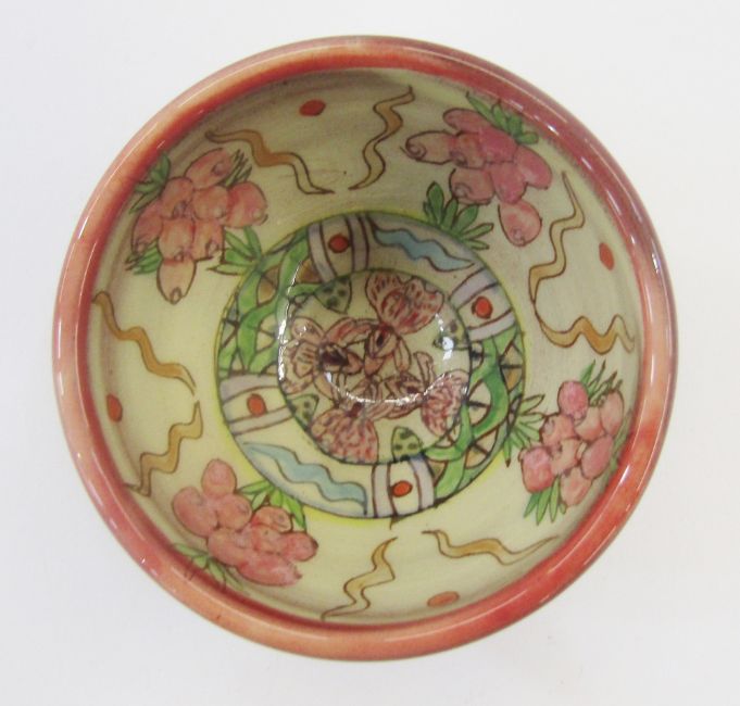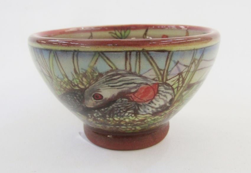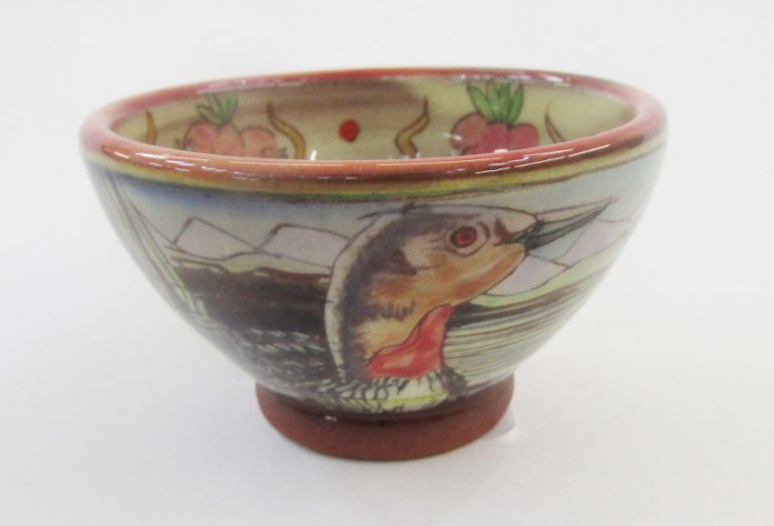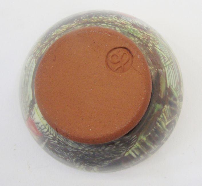 Maureen Minchin, pottery small bowl, decorated with birds and flowers, impressed mark to base, 8cm diameter.
