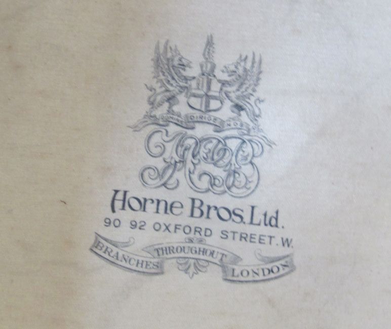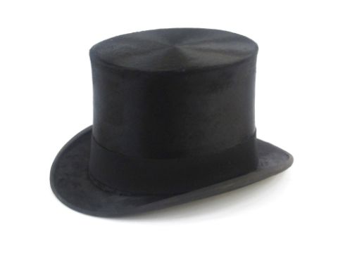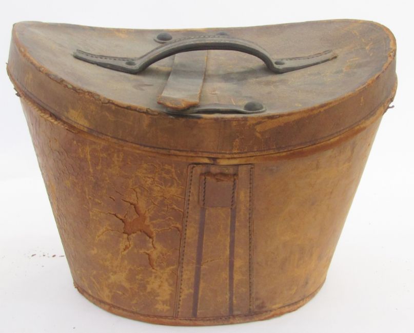 Black silk top hat labelled Horn Bros Limited, Oxford Street, head hole 19.5cm x 15.5cm approx., within original fitted leather box, the lid containing a compartment which fits into the hat which could possibly carry gloves, all held within a leather top hat box (strap broken)