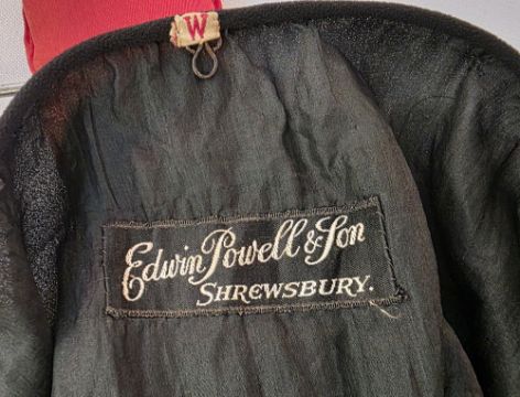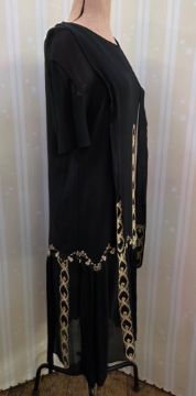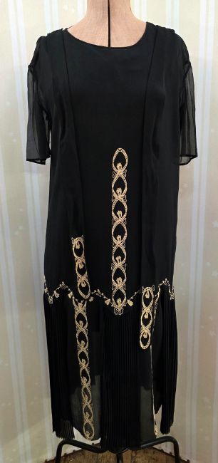 A 1920's crepe and chiffon black dress labelled Edwin Powell & Son, Shrewsbury, the drop waist with pleated panels, embroidered in cream/gold to the front and back of the skirt with an embroidered panel down the front, short chiffon sleeves, and two slim trailing panels from the shoulder, these are pinned on , different lengths